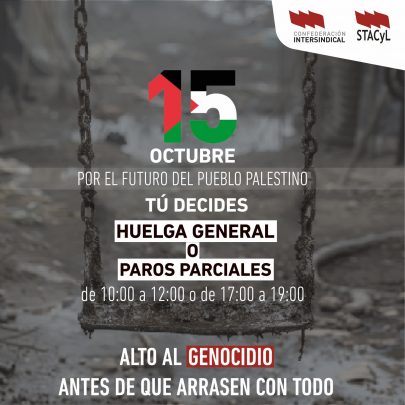 Nuestro sindicato convoca paros parciales de dos horas el miércoles 15 de octubre en apoyo al pueblo palestino y exigiendo el final del genocidio que el Estado israelí está perpetrando en Gaza. Por otro lado, la Confederación Intersindical, de la que forma parte STACYL, ha convocado huelga de 24 horas en todos los sectores y en todo el país. En consecuencia, el día 15, el empleado público castellano y leonés dispondrá de dos modalidades de huelga (parcial de dos horas o de jornada completa).